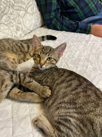 one boy and two girls (cats). 12weeks old gray tabbies rehoming fee$20.00 neg